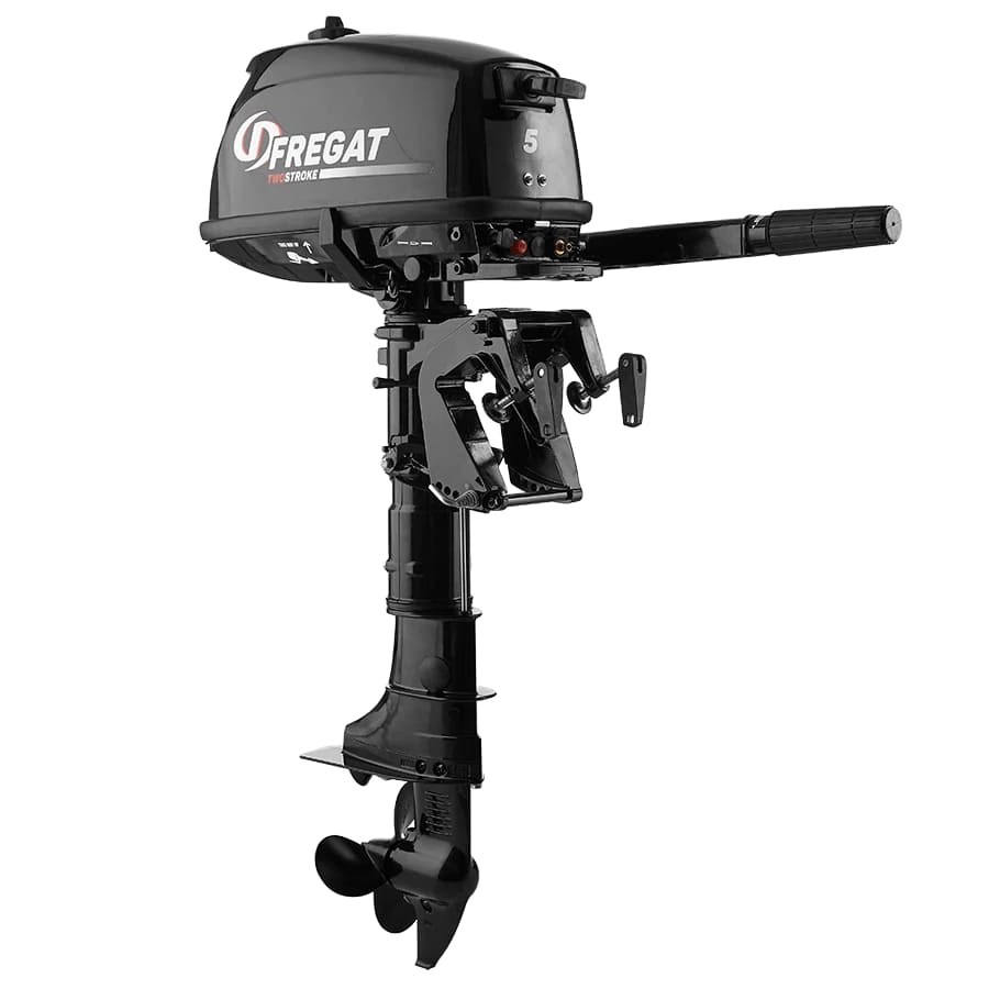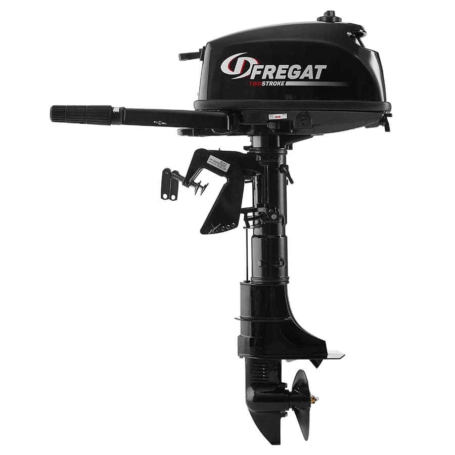 Подвесной мотор для лодки от Fregat работает на 5 лошадиных силах при объеме 102 куб.см и 4500-5500 оборотах.